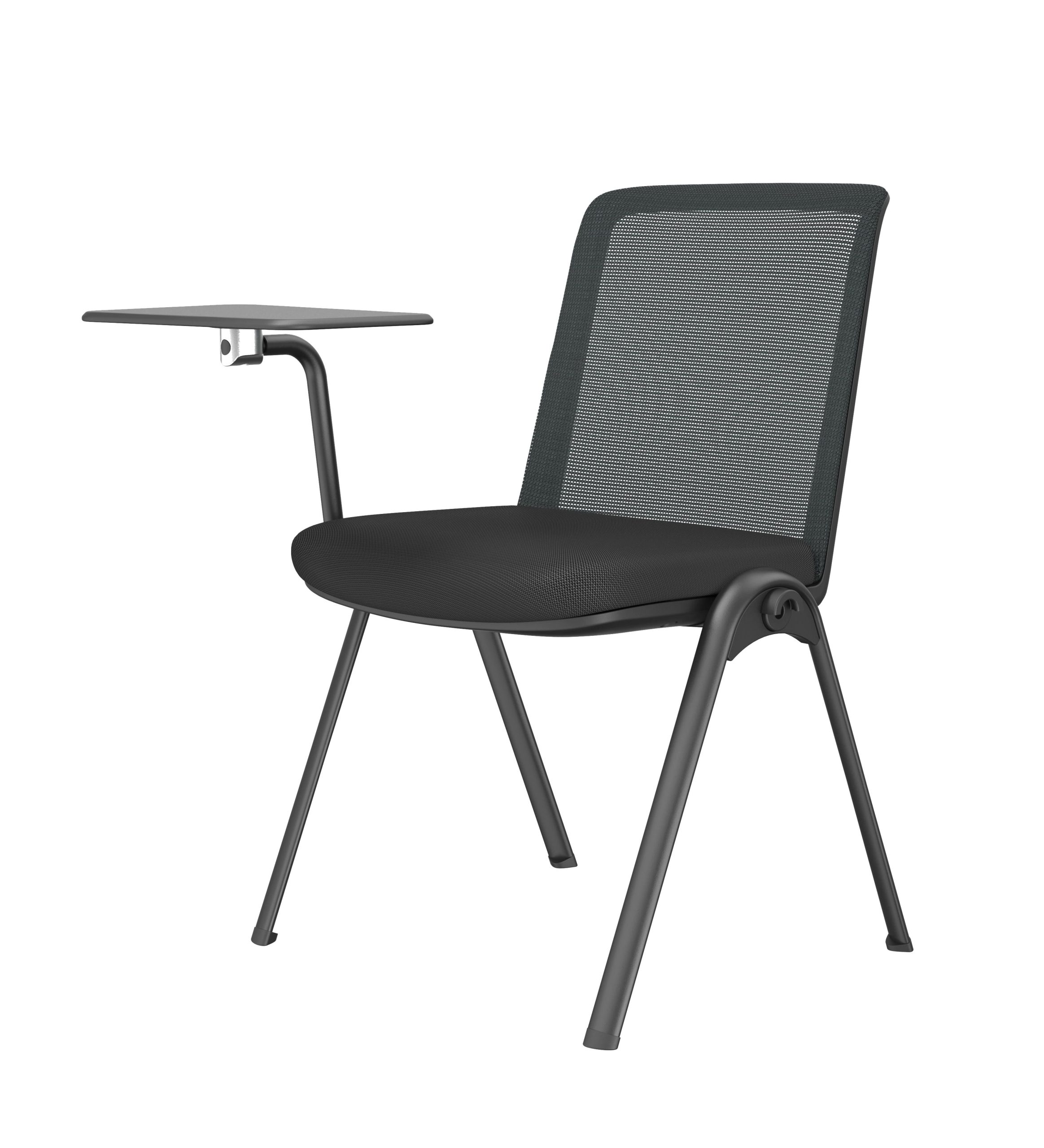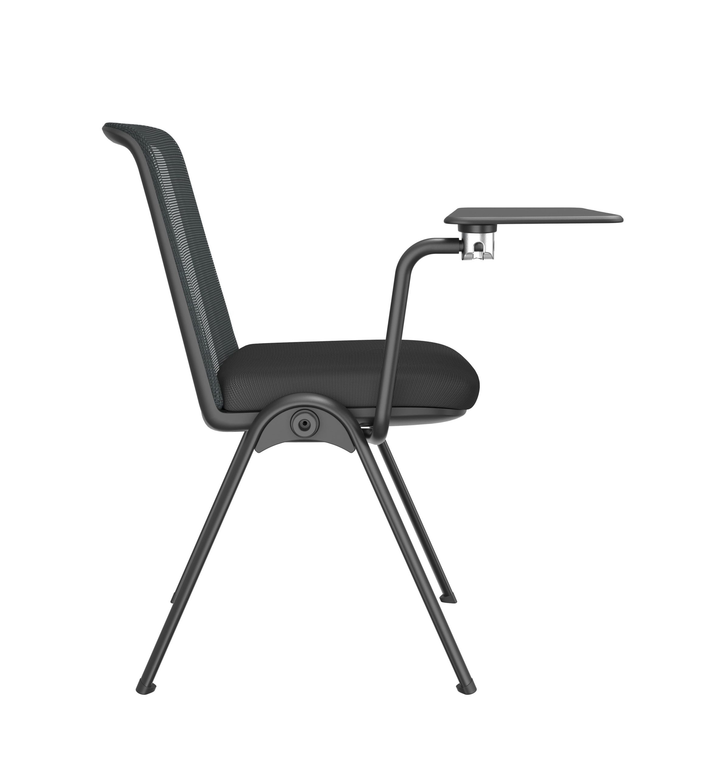 Silla con respaldo de malla y asiento de espuma inyectada tapizado tela negro. Estructura de acero ovalado de cuatro patas pintado electrostáticamente negro. Conectores laterales para fijar sillas entre sí y formar una lineal. Paleta de escritura plegable de PP.