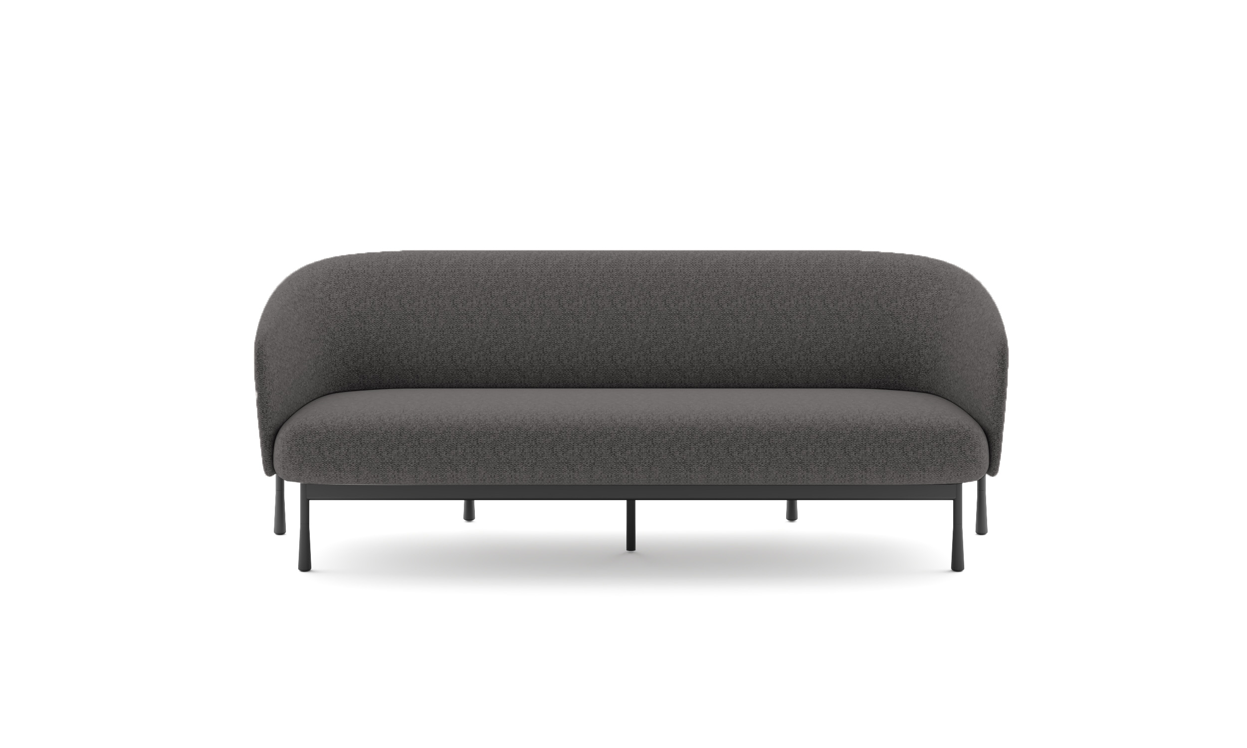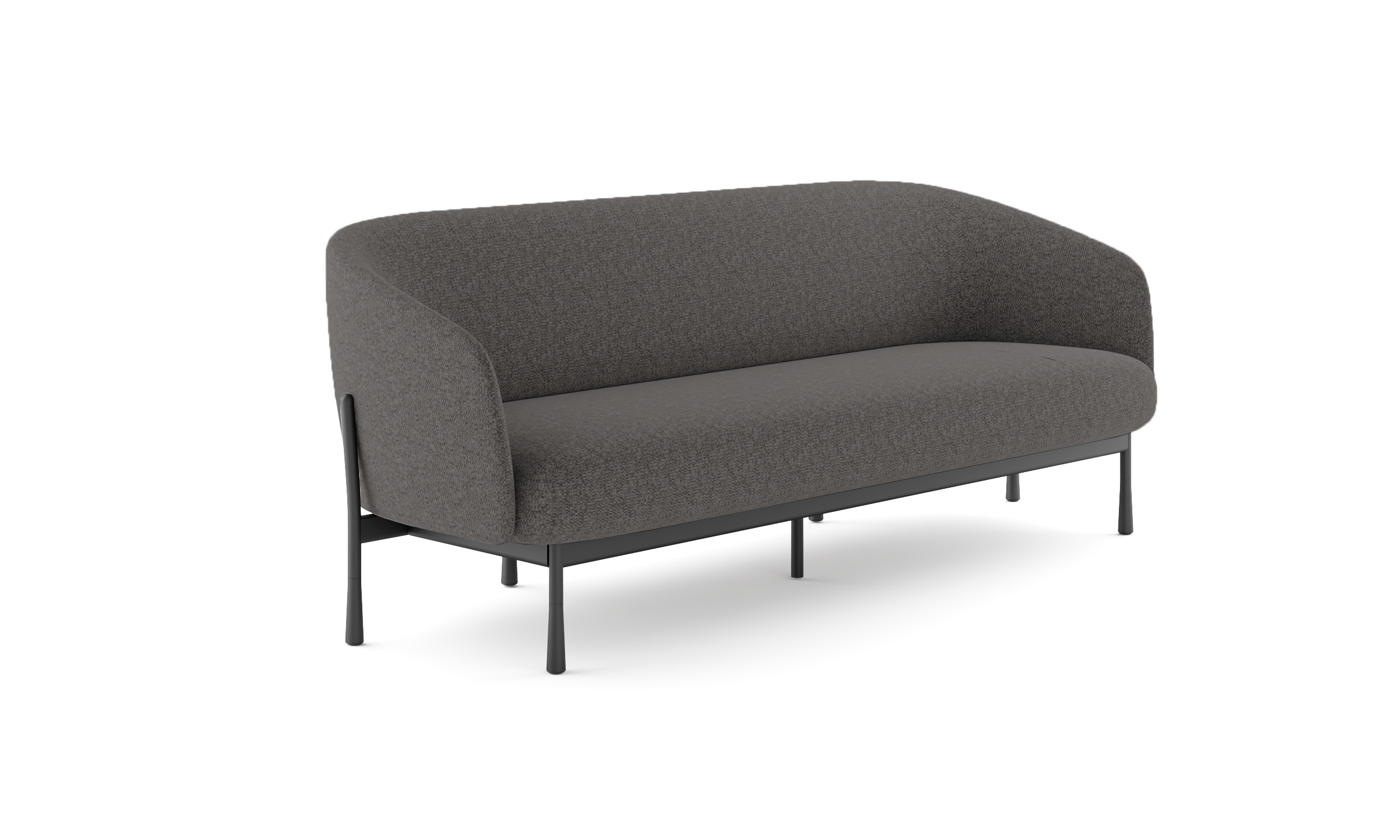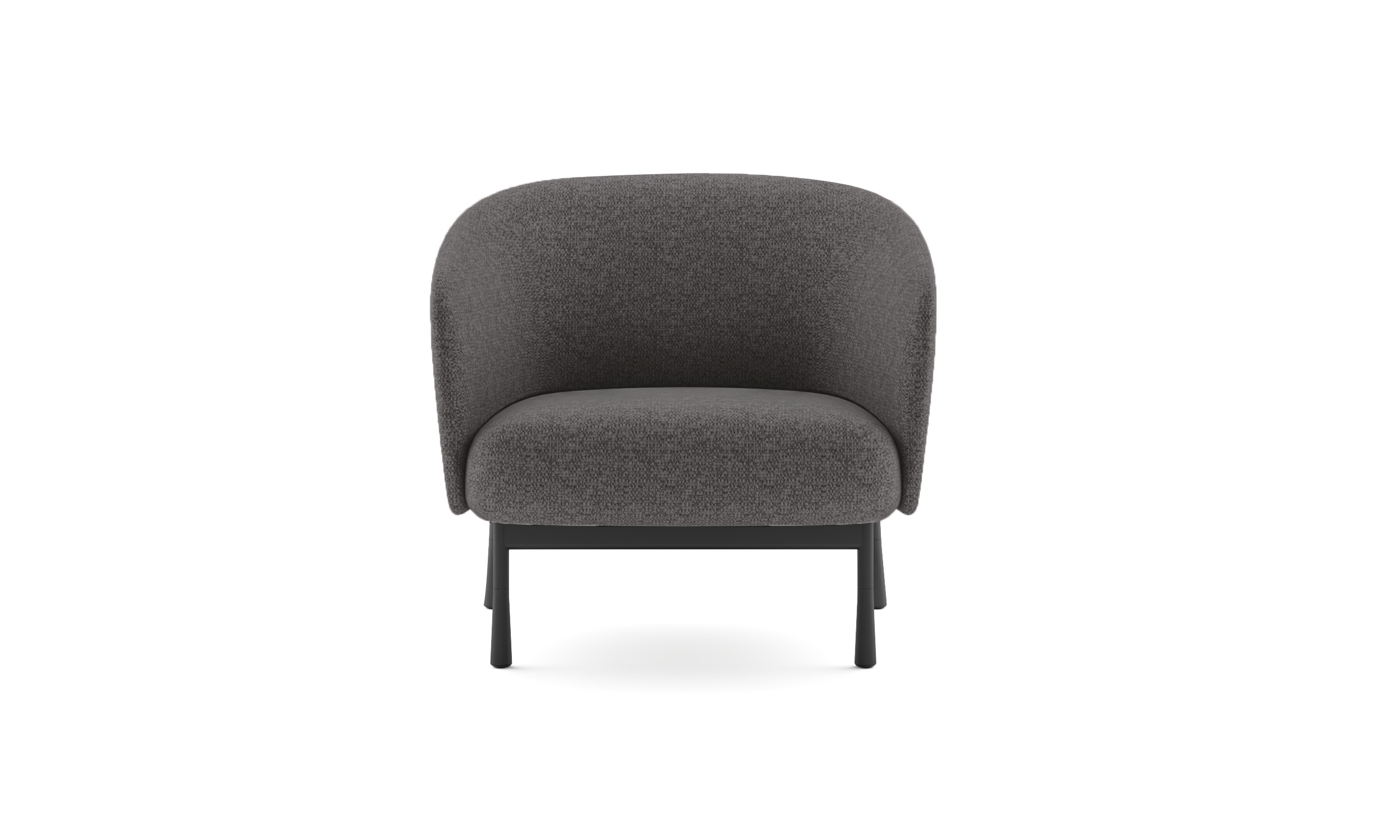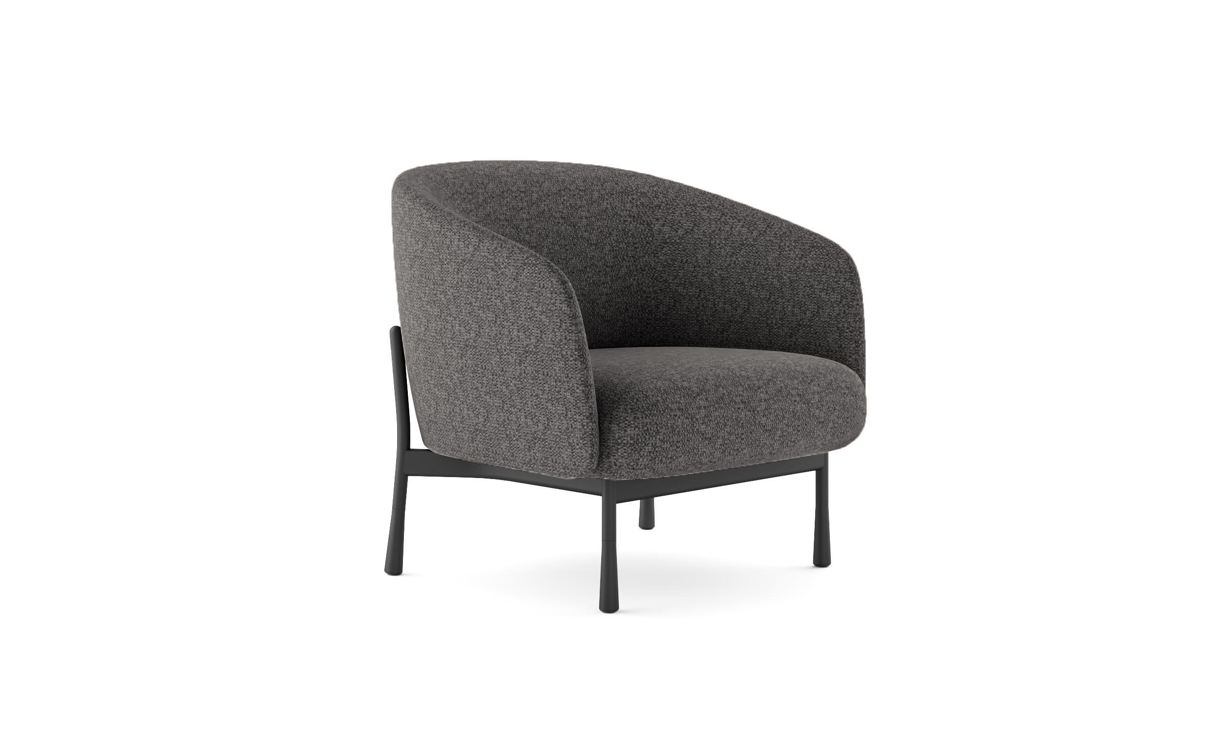Sillón de un cuerpo de espuma de alta densidad tapizado en tela gris. Soporte con marco de madera en respaldo y asiento junto con base de patas de acero cónico de 2 mm pintado negro.