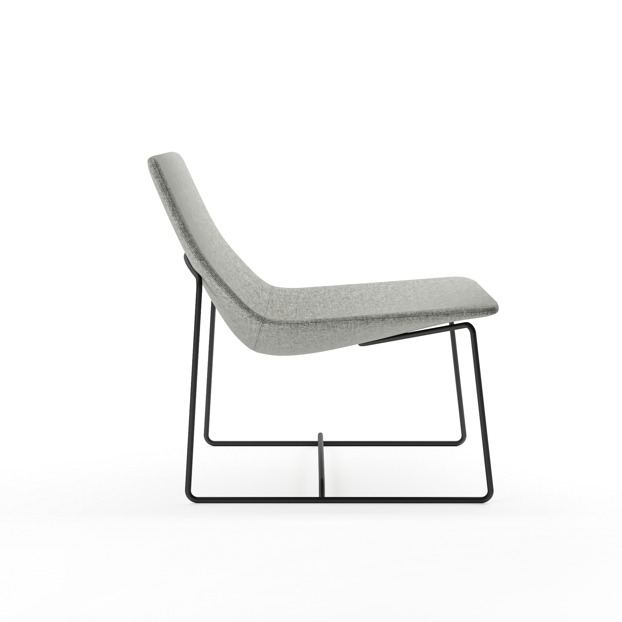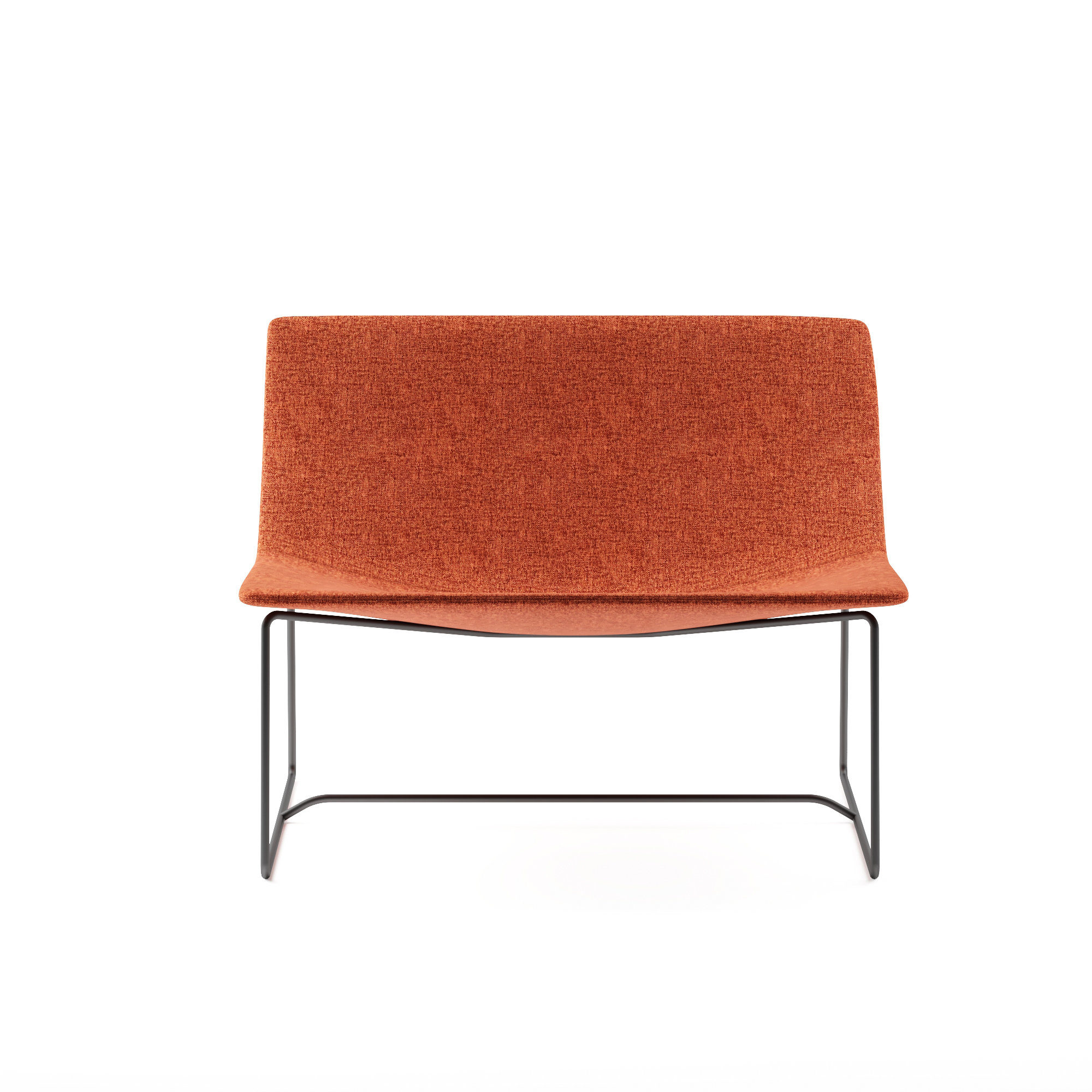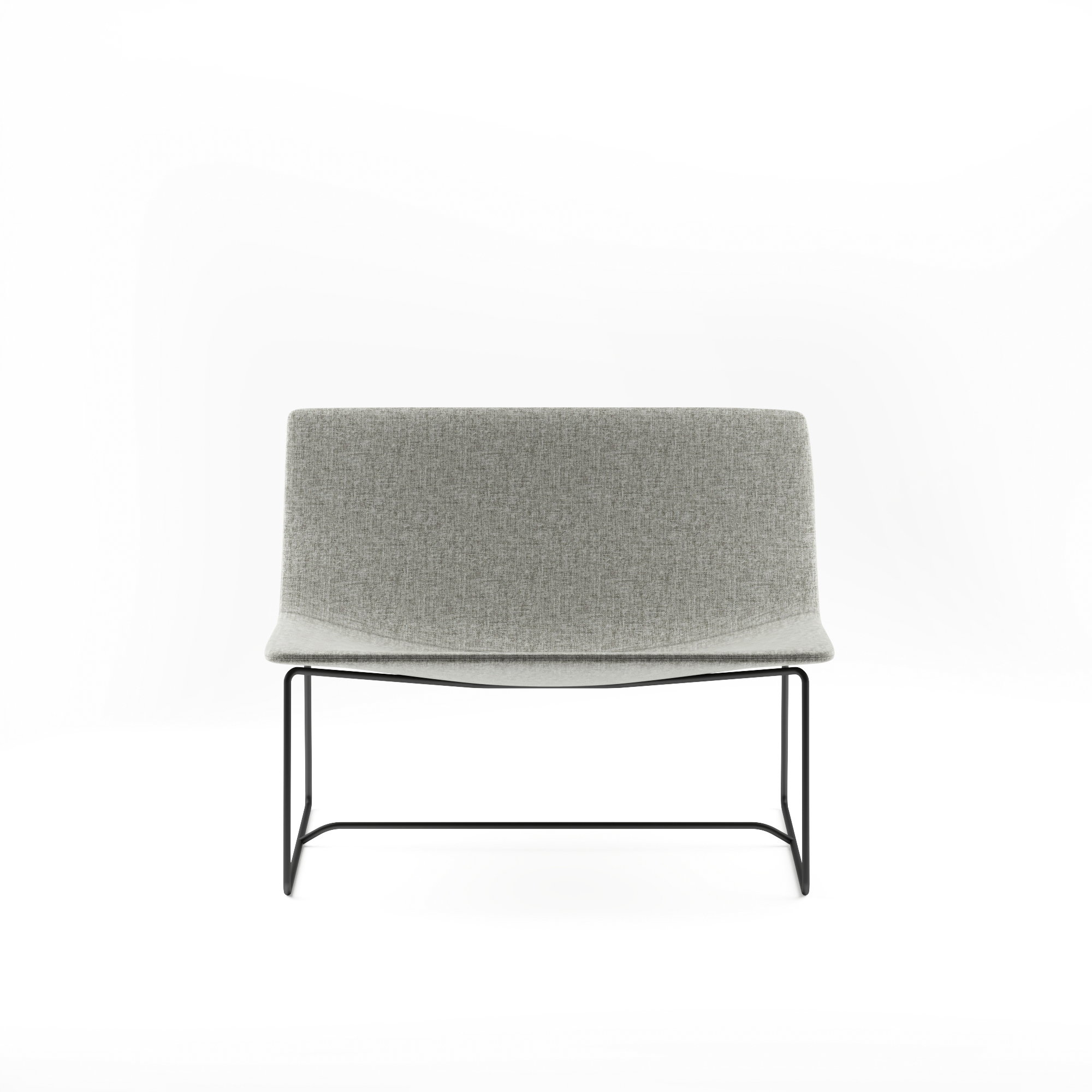 Sillón con respaldo y asiento en estructura de acero con espuma de alta densidad y tapizada completamente en tela . Base de acero trefilado tipo hilo pintado negro de 16 mm con regatones de PP transparente