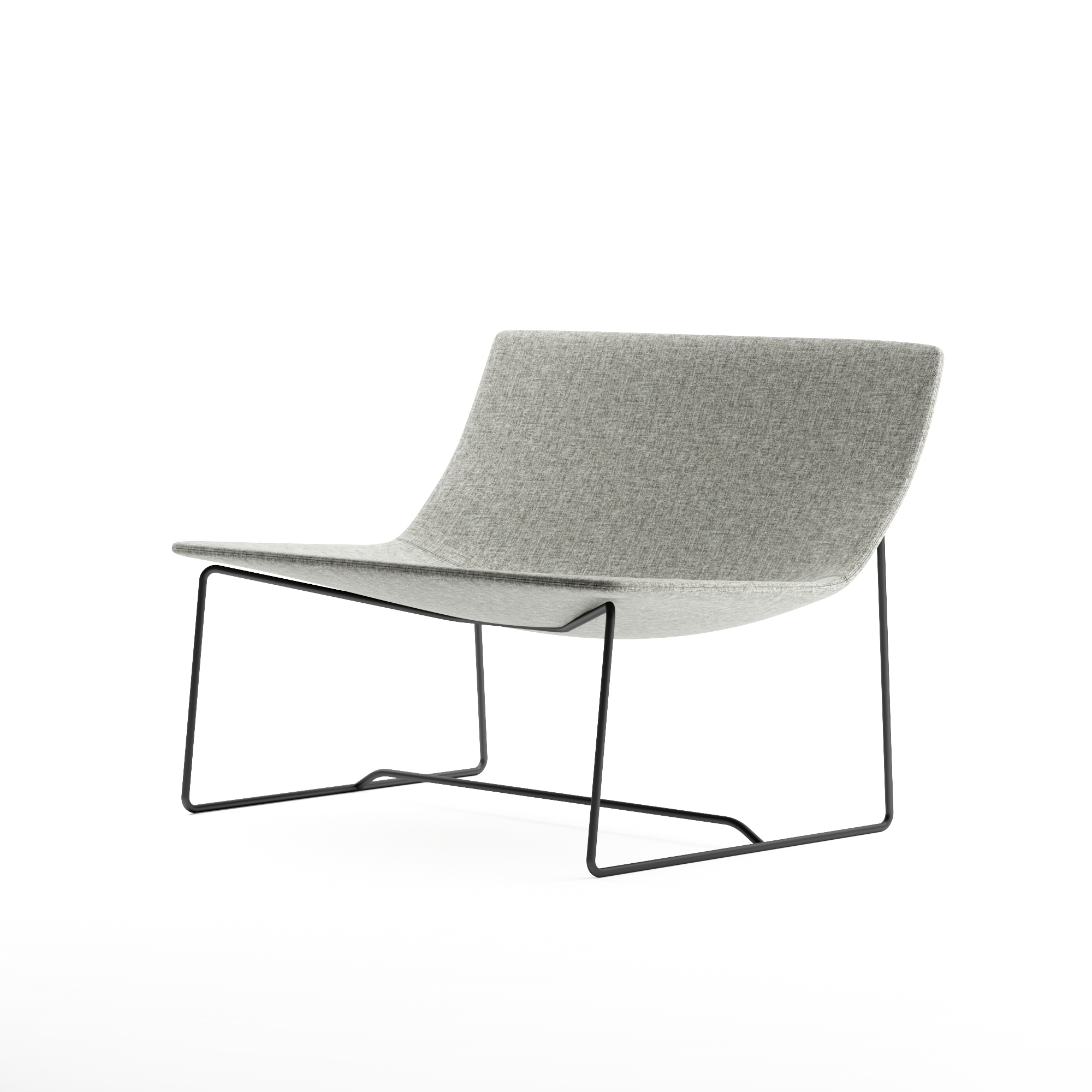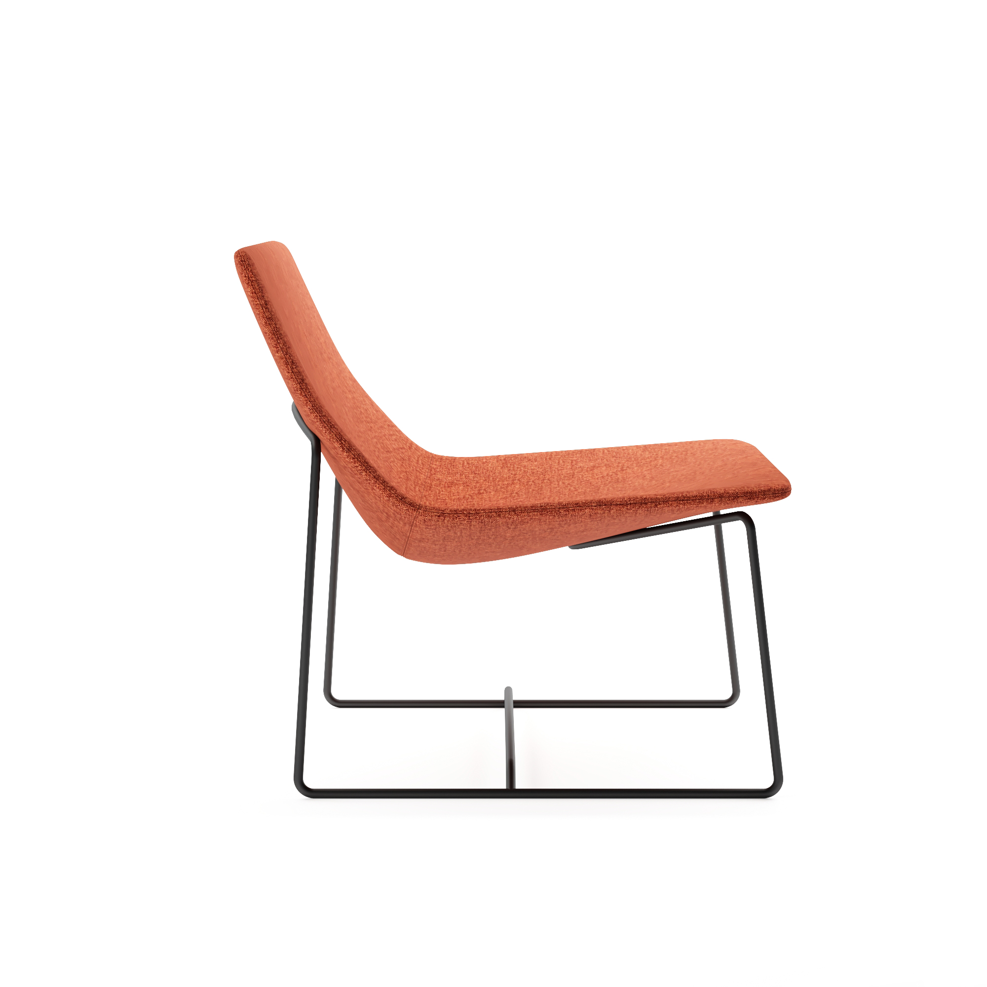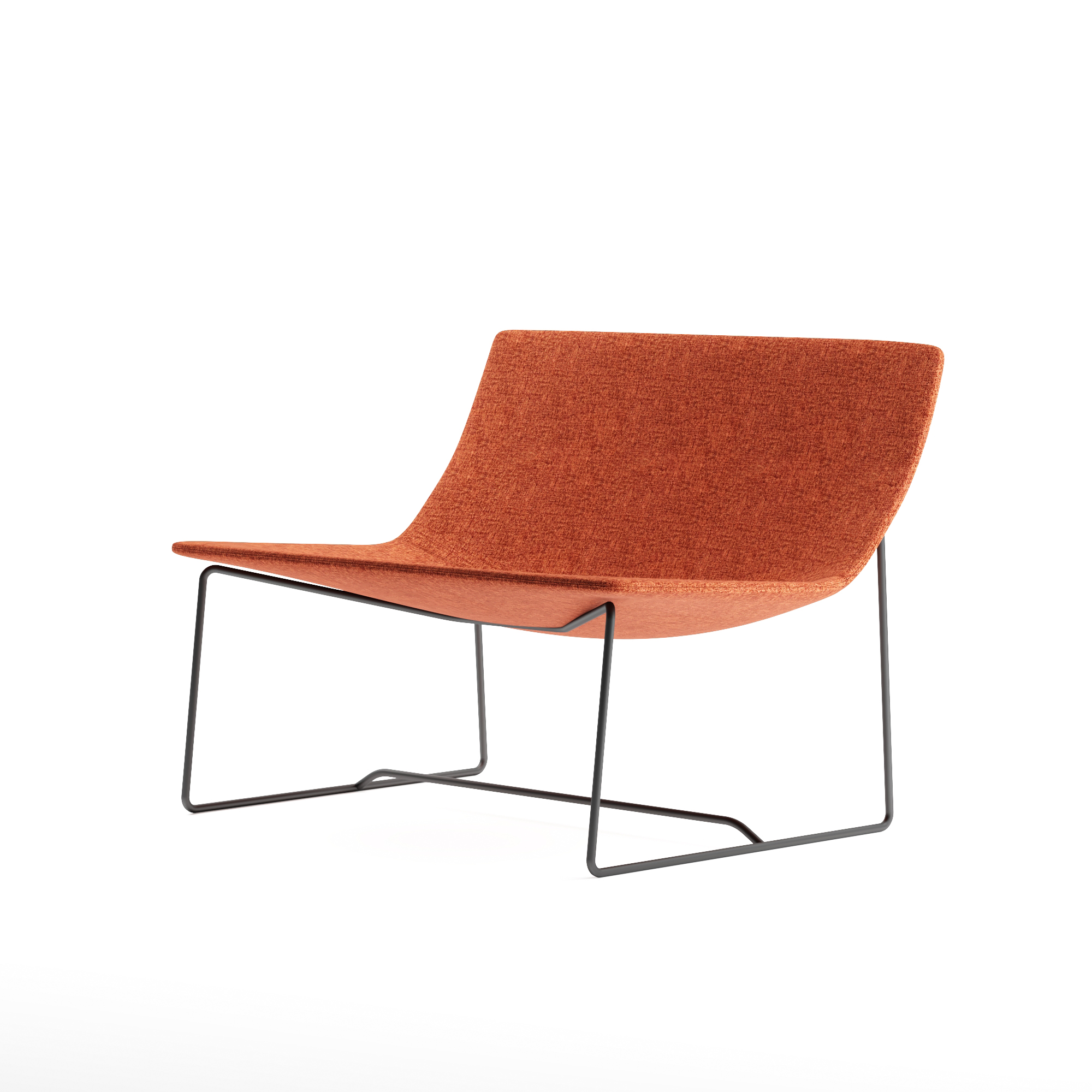 Sillón con respaldo y asiento en estructura de acero con espuma de alta densidad y tapizada completamente en tela . Base de acero trefilado tipo hilo pintado negro de 16 mm con regatones de PP transparente